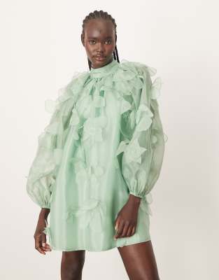ARRANGE - Robe trapèze courte en organza à col montant et appliqués fleurs - Vert clair