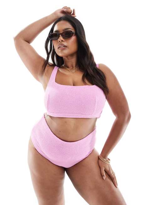 ASOS DESIGN Curve - Charlene - Bas de bikini échancré texturé à taille haute - Rose clair