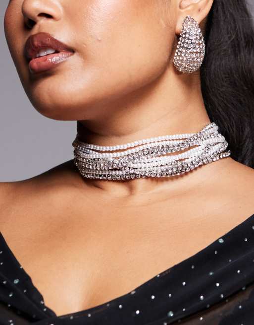 ASOS DESIGN Curve - Collier ras de cou à multiples rangs de perles et cristaux - Argenté
