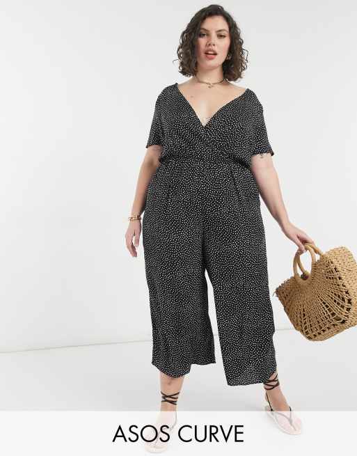 ASOS DESIGN Curve - Combinaison jupe-culotte cache-cœur à pois - Noir et blanc