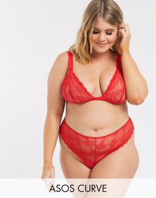 ASOS DESIGN Curve - Eliza - Ensemble string et soutien-gorge triangle doux en dentelle avec bonnets entiers - Rouge