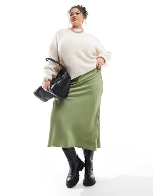 ASOS DESIGN Curve - Jupe mi-longue coupée en biais en satin - Kaki