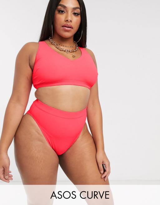 ASOS DESIGN Curve - Mix and Match - Bas de bikini taille haute échancré à côtes - Rouge