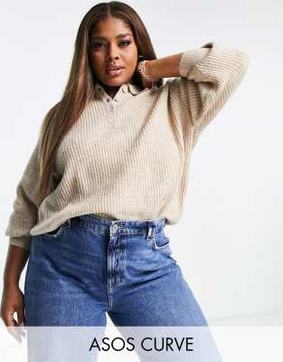 ASOS DESIGN Curve - Pull côtelé à col polo - Grège