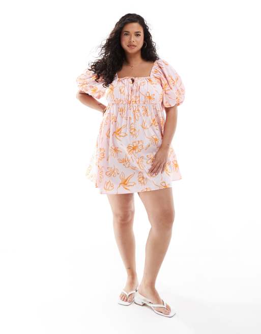 ASOS DESIGN Curve - Robe babydoll courte à fleurs et manches bouffantes - Orange