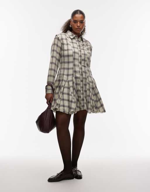ASOS DESIGN Curve - Robe chemise courte à carreaux avec taille pincée et godets - Gris délavé/bleu