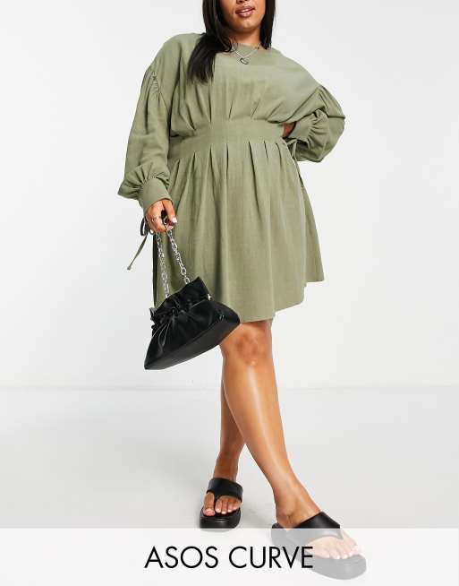 ASOS DESIGN Curve - Robe courte en lin à taille cintrée - Kaki