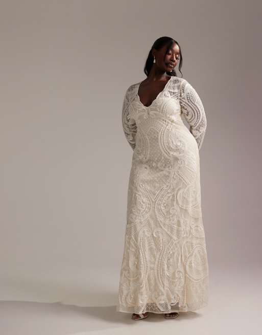 ASOS DESIGN Curve - Robe de mariée longue à broderies avec manches longues et décolleté plongeant - Ivoire
