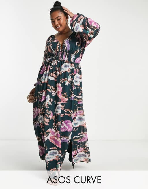 ASOS DESIGN Curve - Robe longue douce à taille froncée - Noir fleuri