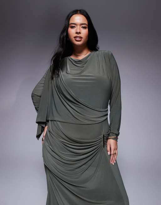ASOS DESIGN Curve - Robe longue effet drapé à manches longues avec jupe froncée et détail métallique - Kaki