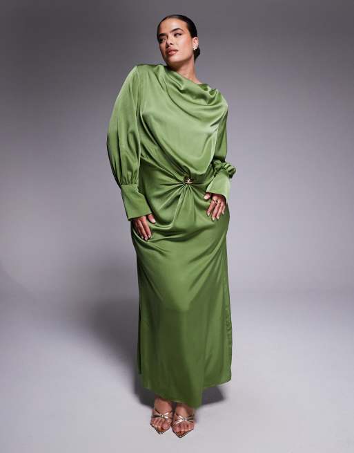 ASOS DESIGN Curve - Robe longue effet torsadé sur l'avant en satin coupé en biais avec détail métallique doré - Vert olive