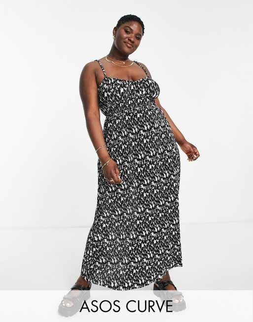 ASOS DESIGN Curve - Robe longue plissée à bretelles - Noir à petites fleurs blanches