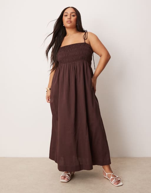 ASOS DESIGN Curve - Robe longue satinée en coton avec buste froncé - Chocolat