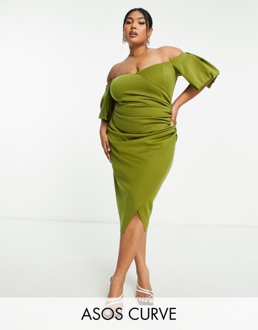 ASOS DESIGN Curve - Robe mi-longue à épaules dénudées style Bardot et décolleté en cœur - Olive