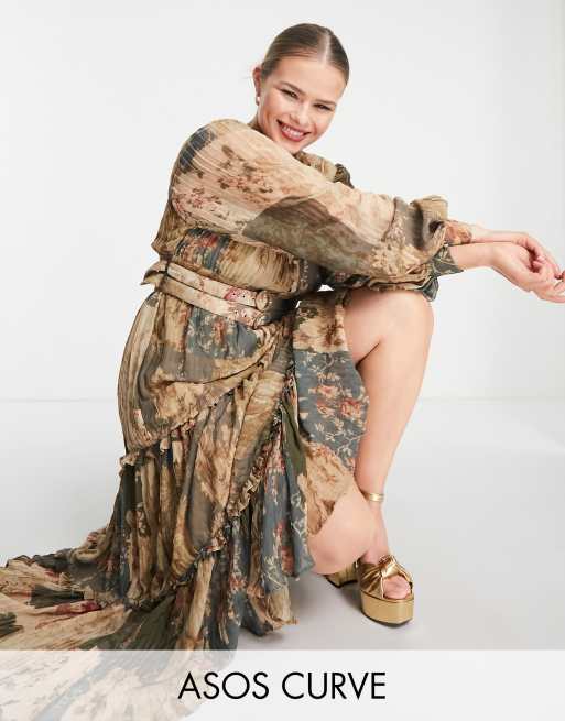 ASOS DESIGN Curve - Robe mi-longue à imprimé patchwork avec double ceinture et détail plissé