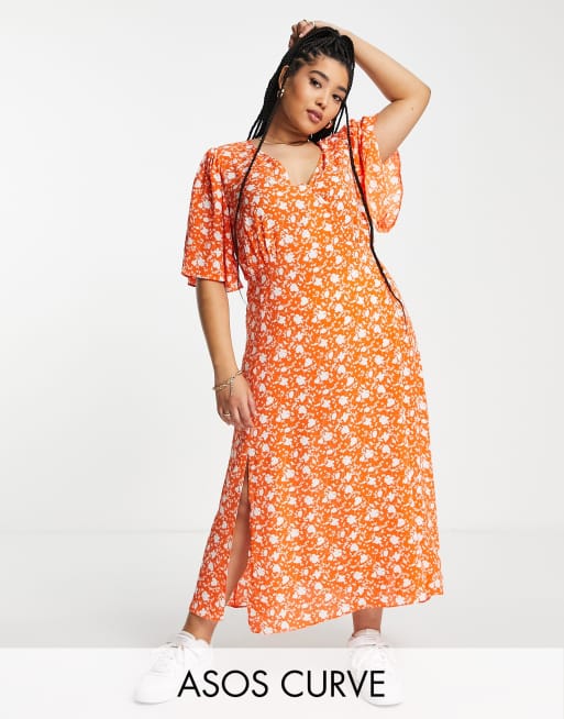 ASOS DESIGN Curve - Robe mi-longue à manches ange - Rouge fleuri