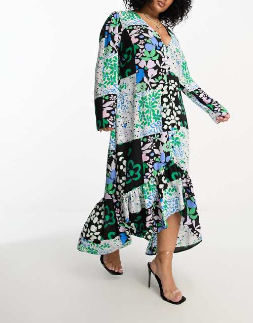 ASOS DESIGN Curve - Robe mi-longue à ourlet asymétrique et imprimé fleuri effet raccordé