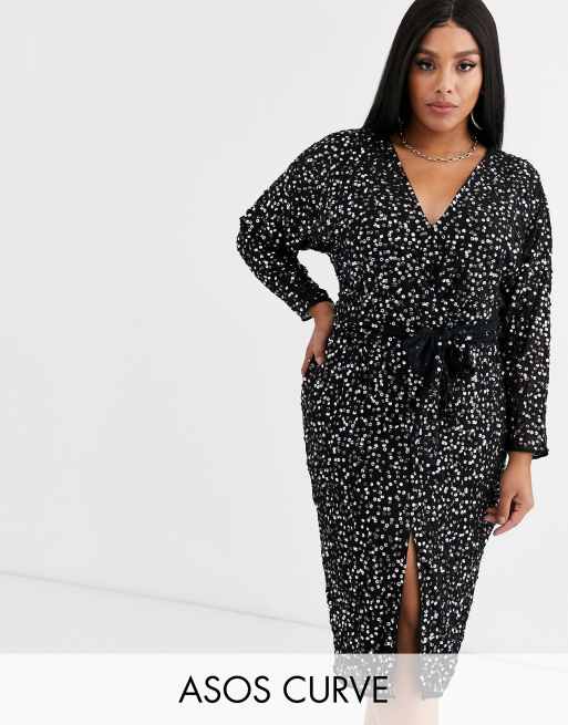 ASOS DESIGN Curve - Robe mi-longue à sequins avec manches chauve-souris et taille croisée
