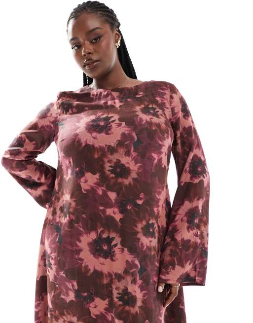 ASOS DESIGN Curve - Robe mi-longue en viscose à imprimé fleuri flou avec encolure bateau et détail en V dans le dos - Rouge
