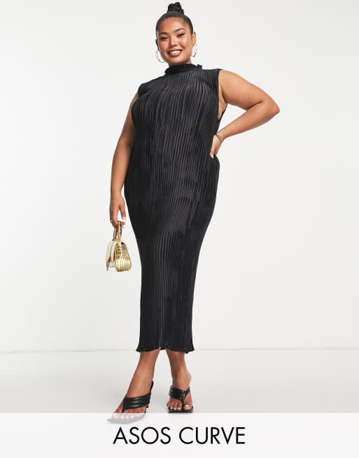 ASOS DESIGN Curve - Robe mi-longue plissée effet satiné à col montant - Noir