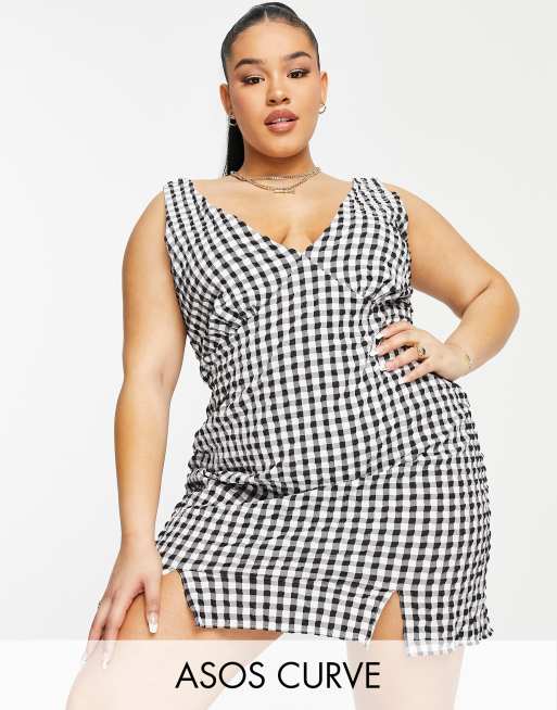 ASOS DESIGN Curve - Robe nuisette d'été courte en tissu texturé à col V et carreaux vichy - Noir et blanc