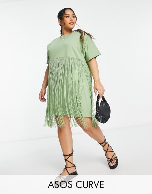 ASOS DESIGN Curve - Robe t-shirt courte à franges - Olive
