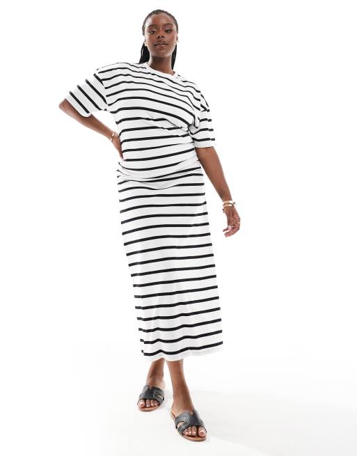 ASOS DESIGN Curve - Robe t-shirt mi-longue à rayures avec col ras de cou et fronces sur le côté - Noir et blanc