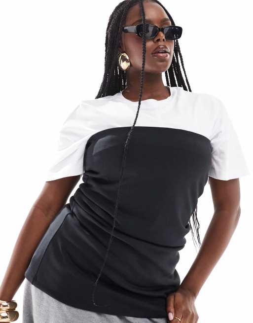ASOS DESIGN Curve - T-shirt 2-en-1 en tissu effet néoprène - Noir et blanc