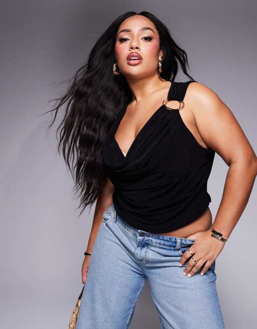 ASOS DESIGN Curve - Top à col bénitier pigeonnant avec finition - Noir