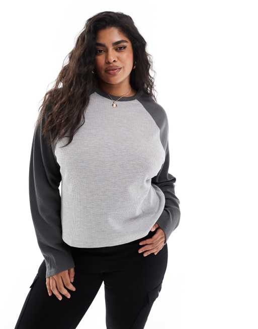 ASOS DESIGN Curve - Top à manches raglan longues en tissu gaufré - Anthracite et gris