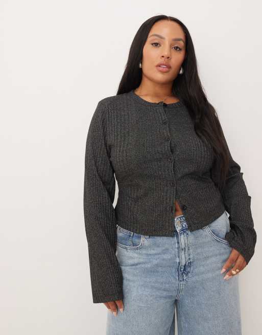 ASOS DESIGN Curve - Top côtelé à manches longues et fermeture boutonnée - Anthracite délavé