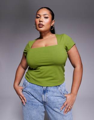 ASOS DESIGN Curve - Top double épaisseur avec mancherons et encolure carrée - Vert kaki