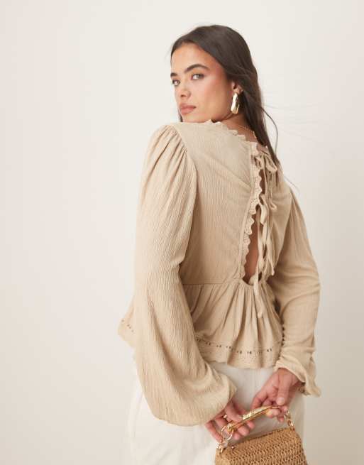 ASOS DESIGN Curve - Top froissé à manches longues noué dans le dos avec ourlet en broderie anglaise - Taupe