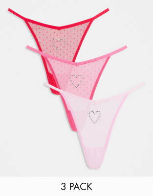 ASOS DESIGN - Lot de 3 strings en tulle à pois avec devant en V et cœur à strass - Rose et rouge
