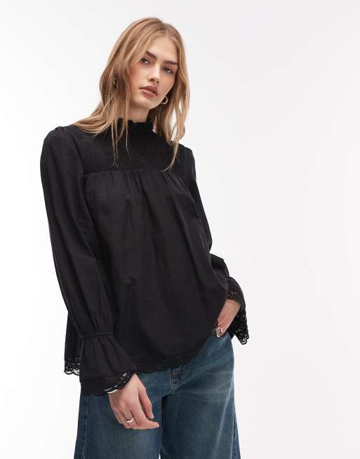 ASOS DESIGN - Blouse babydoll froncée à détails en dentelle - Noir
