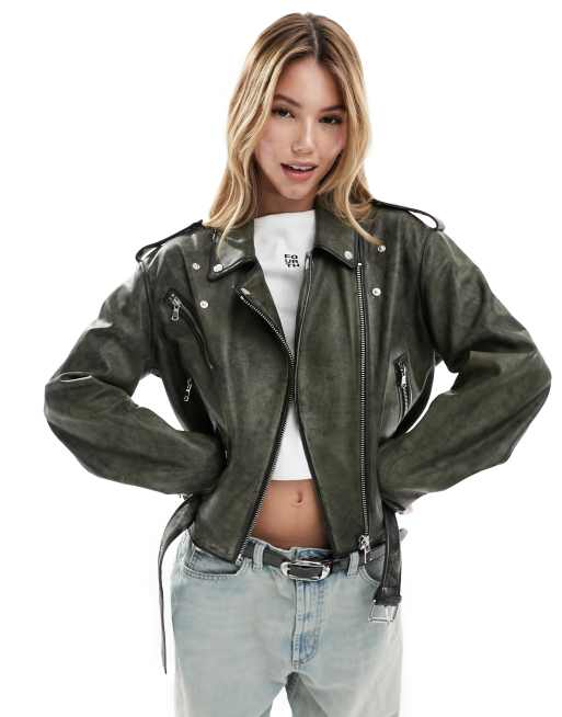 ASOS DESIGN - Blouson en cuir style motard effet délavé - Vert teinté délavé