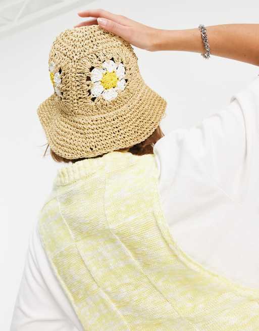 ASOS DESIGN - Bob en paille au crochet avec fleurs à taille ajustable - Naturel