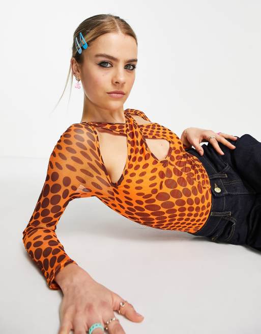 ASOS DESIGN - Body cache-cœur à manches longues - Orange à pois