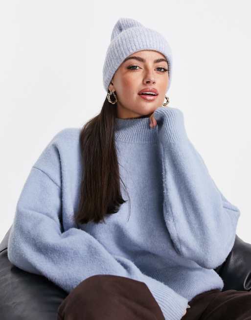 ASOS DESIGN - Bonnet côtelé à large revers - Bleu clair chiné