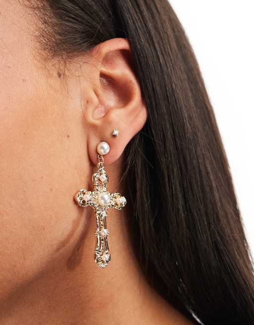 ASOS DESIGN - Boucles d'oreilles avec pendant croix ornée de fausses perles - Doré