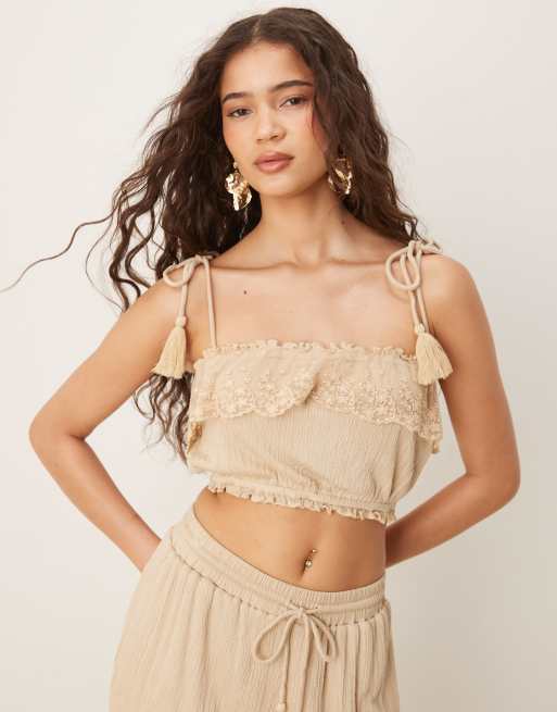 ASOS DESIGN - Brassière d'ensemble froissée avec bretelles nouées et finitions en dentelle - Taupe