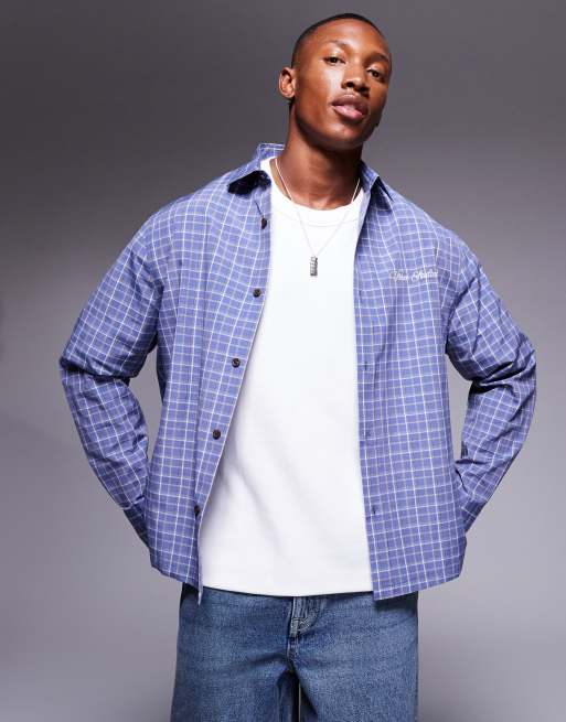 ASOS DESIGN - Chemise à carreaux coupe carrée avec broderie sur la poitrine - Bleu