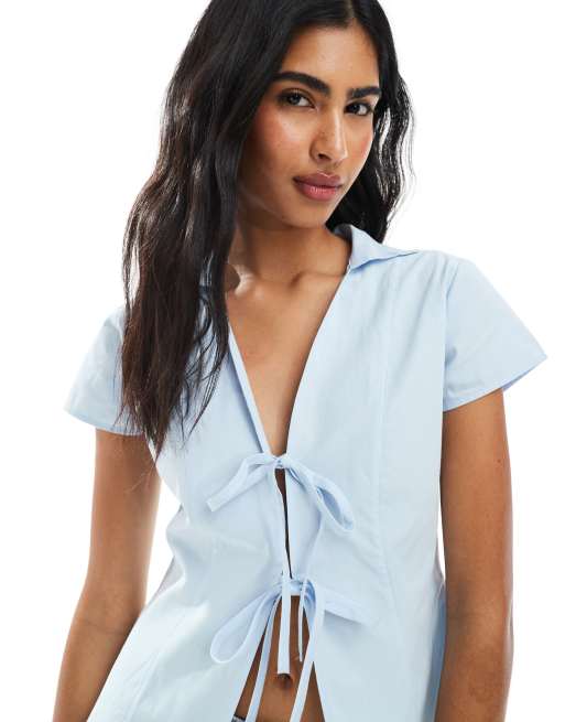 ASOS DESIGN - Chemise ajustée nouée sur l'avant en popeline - Bleu