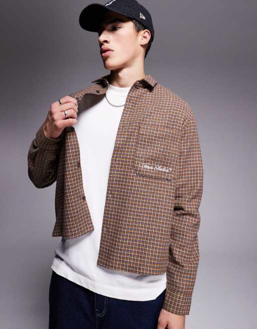 ASOS DESIGN - Chemise coupe carrée à carreaux aspect laine avec broderie sur la poitrine - Marron