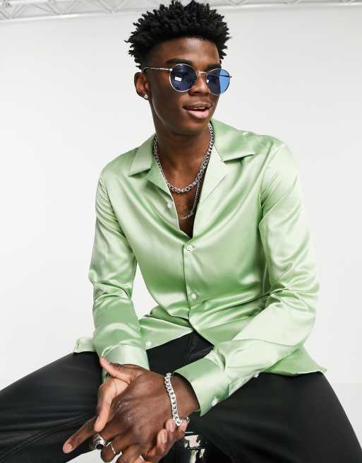 ASOS DESIGN - Chemise coupe skinny en satin style années 70 avec col - Vert sauge