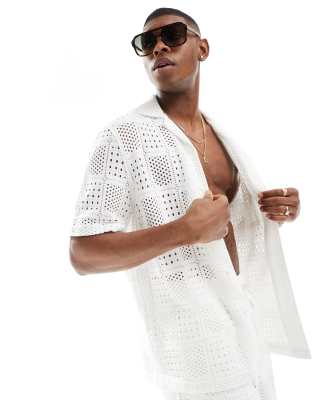 ASOS DESIGN - Chemise d'ensemble coupe décontractée en dentelle crochet avec manches courtes et col à revers - Blanc
