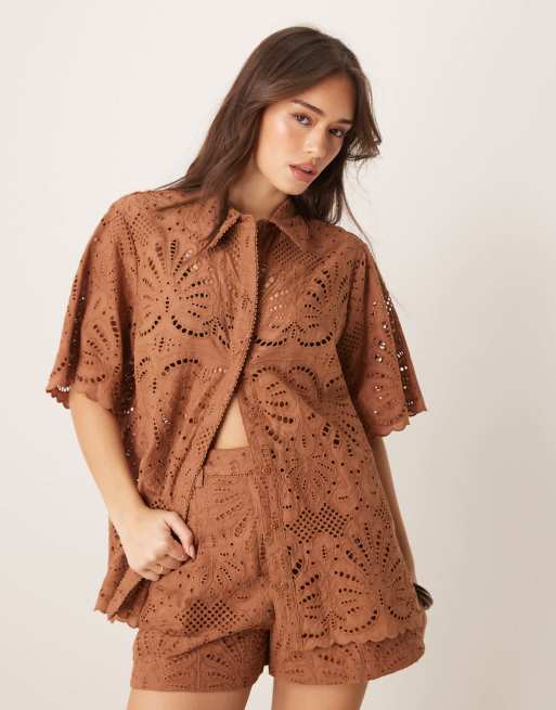 ASOS DESIGN - Chemise d'ensemble en broderie anglaise de qualité supérieure - Moka