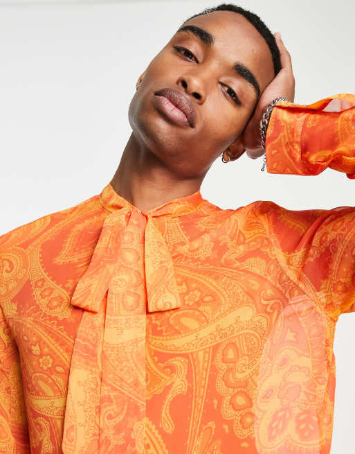 ASOS DESIGN - Chemise en satin à motif cachemire avec col lavallière et manches blouson - ORANGE