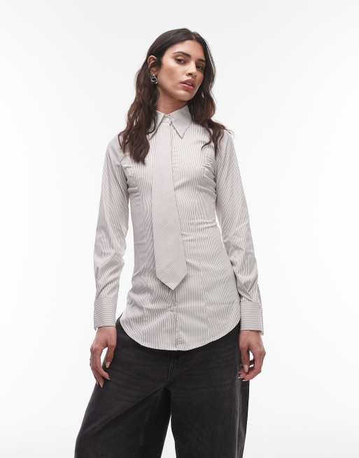 ASOS DESIGN - Chemise rayée cintrée à la taille avec cravate assortie - Beige