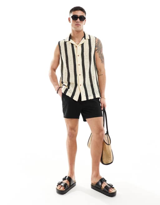 ASOS DESIGN - Chemise sans manches décontractée en maille au crochet rayée avec col à revers - Noir et blanc